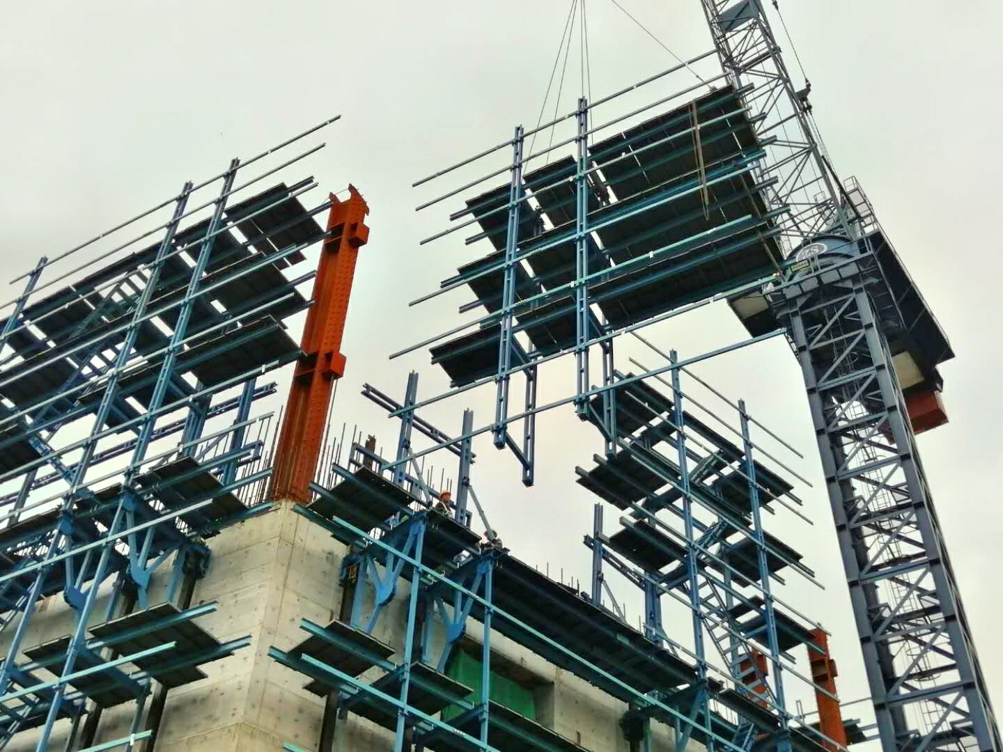 項(xiàng)目采用了基于鋁模的液壓智能爬升模板技術(shù),并結(jié)合項(xiàng)目特點(diǎn),開展QC攻關(guān)活動(dòng),QC成果《提高超高層建筑標(biāo)準(zhǔn)層施工效率》助力塔樓核心筒快速爬升,QC成果《提高圓柱處塔吊附墻預(yù)埋合格率》將圓柱處塔吊附墻預(yù)埋合格率從71%提高到了93%。搭建BIM 5D智慧管理平臺,采用互聯(lián)網(wǎng)、物聯(lián)網(wǎng)技術(shù)實(shí)時(shí)監(jiān)測項(xiàng)目各項(xiàng)施工數(shù)據(jù),運(yùn)用BIM 5D智能管理平臺替代傳統(tǒng)施工管理模式,實(shí)現(xiàn)生產(chǎn)、技術(shù)、質(zhì)量和安全多板塊數(shù)字化、智能化管理。通過BIM建模技術(shù)對建筑、結(jié)構(gòu)、機(jī)電、鋼結(jié)構(gòu)、場地等專業(yè)精細(xì)化模型建模,進(jìn)行碰撞檢查、施工模擬、復(fù)雜節(jié)點(diǎn)深化,預(yù)演建造過程,有效減少設(shè)計(jì)中錯(cuò)漏碰缺,通過管線綜合優(yōu)化,模型出圖指導(dǎo)現(xiàn)場施工,精準(zhǔn)定位預(yù)留預(yù)埋。